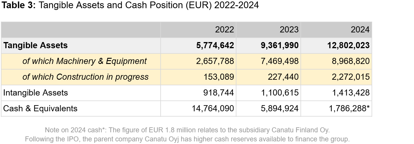 A look at investments and the balance sheet clearly shows that Canatu is not preparing for short-term profit optimization, but for a much bigger game. In 2024 alone, the company invested a total of €5.0 million in fixed assets. These funds did not go into marketing or administrative comfort, but primarily into physical manufacturing infrastructure.