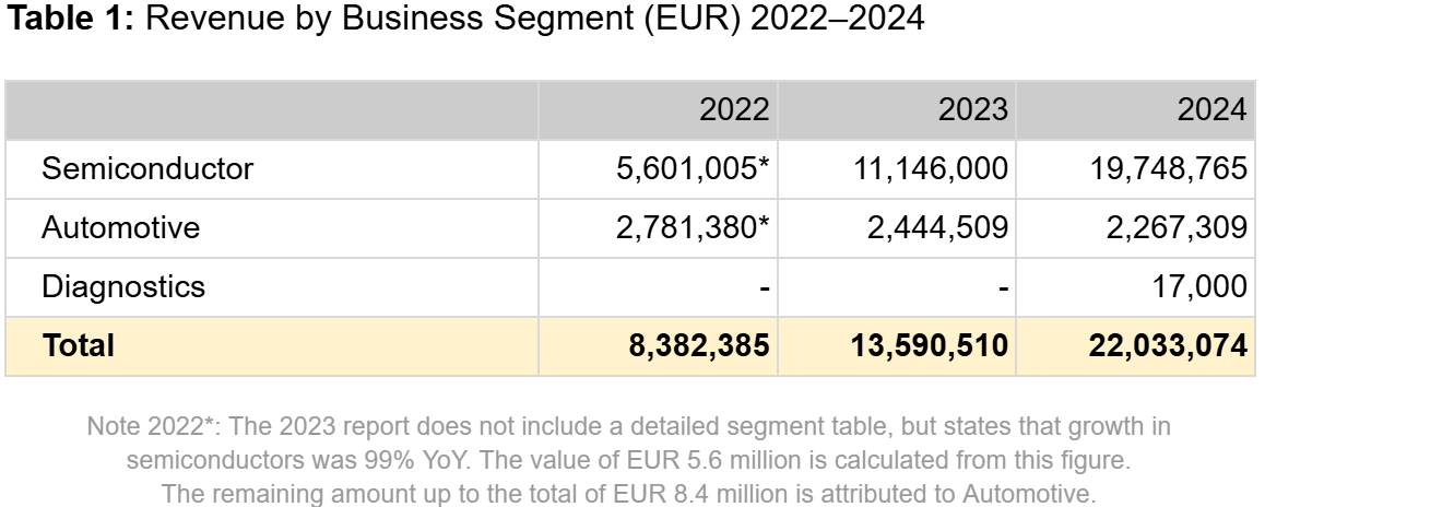 Total revenue grew by a significant 62.1% year-over-year (YoY), reaching €22.0 million, compared to €13.6 million in 2023. This growth was not broad-based but unequivocally driven by a single segment, semiconductors.