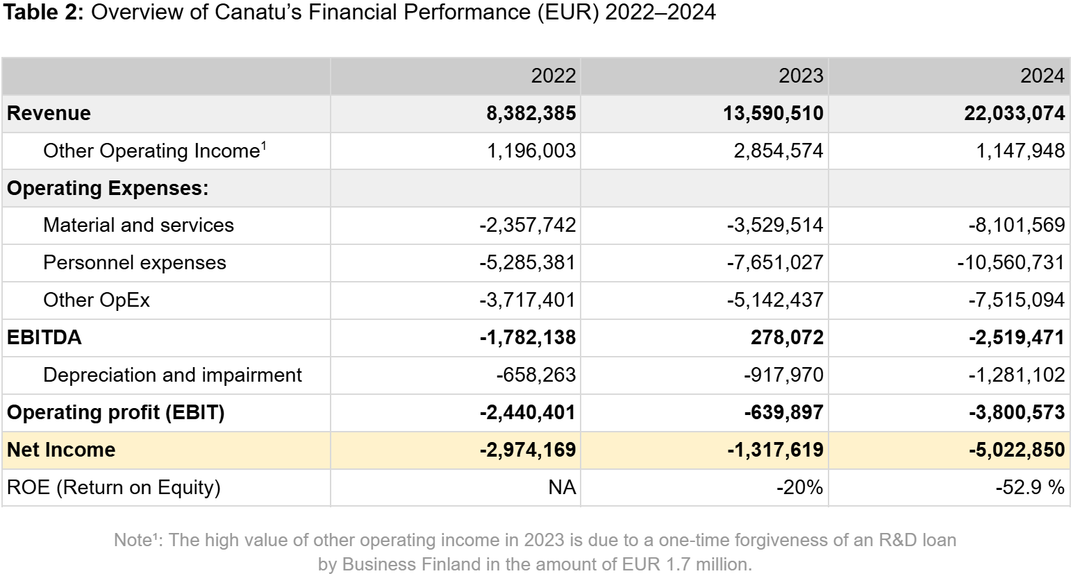 As with most fast-growing deep-tech companies, revenue growth at Canatu does not yet translate to profitability. The firm remained in the red in 2024, which is an expected rather than a negative surprise at this stage of development. EBITDA ended the year in negative territory at −€2.5 million, and the net loss reached −€5.0 million.