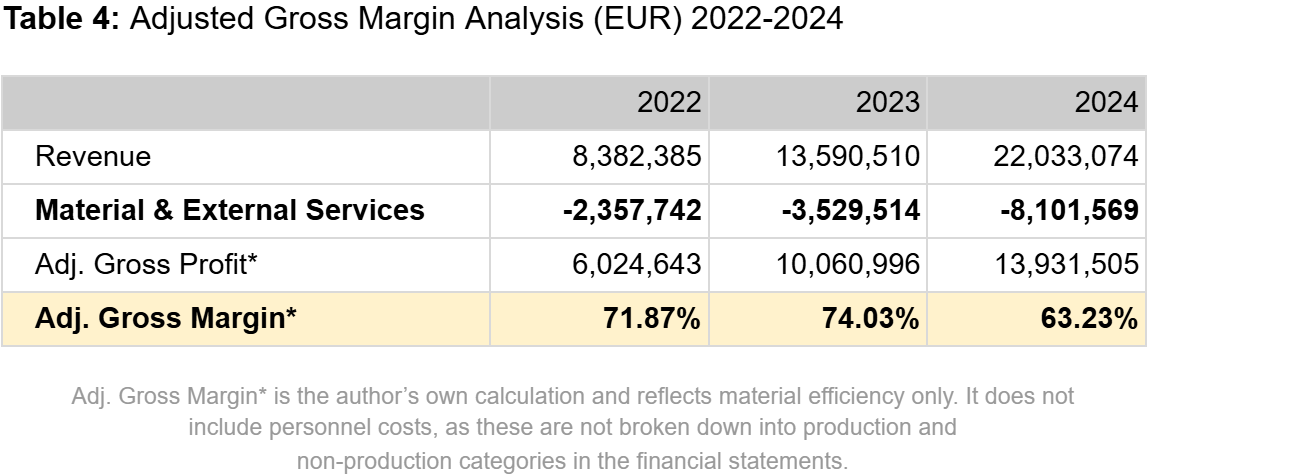 However, looking at the company’s reported figures, we can try to calculate the Gross Margin (specifically Material Margin) to gauge production efficiency. By subtracting material and service costs (€8.1 million) from total revenues of €22.0 million, we arrive at a material margin of approximately 63%. While this is a decrease from the roughly 74% seen in 2023, the drop is logical, the firm began selling hardware (reactors), which is inherently more material-intensive than selling membranes alone. Even so, 63% remains a very healthy figure, indicating a high value-add product.